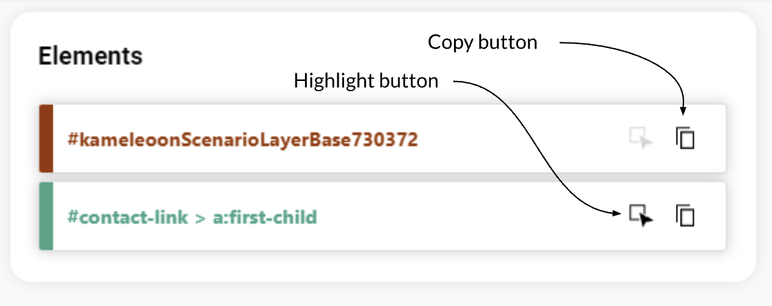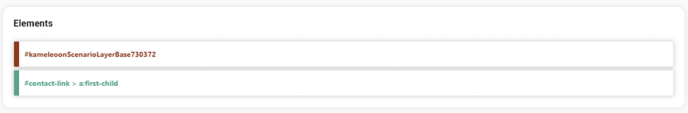 The Elements section lists all elements that Kameleoon changes for a variation. It allows you to debug your campaigns and quickly see if the elements are detected on the page. The element's selector represents each item. When the extension displays the element in red, the element does not appear on the page; in green, the element appears on the page.