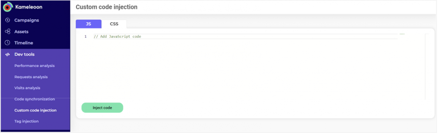 - Click Custom code injection to access the page for managing your custom JavaScript code.