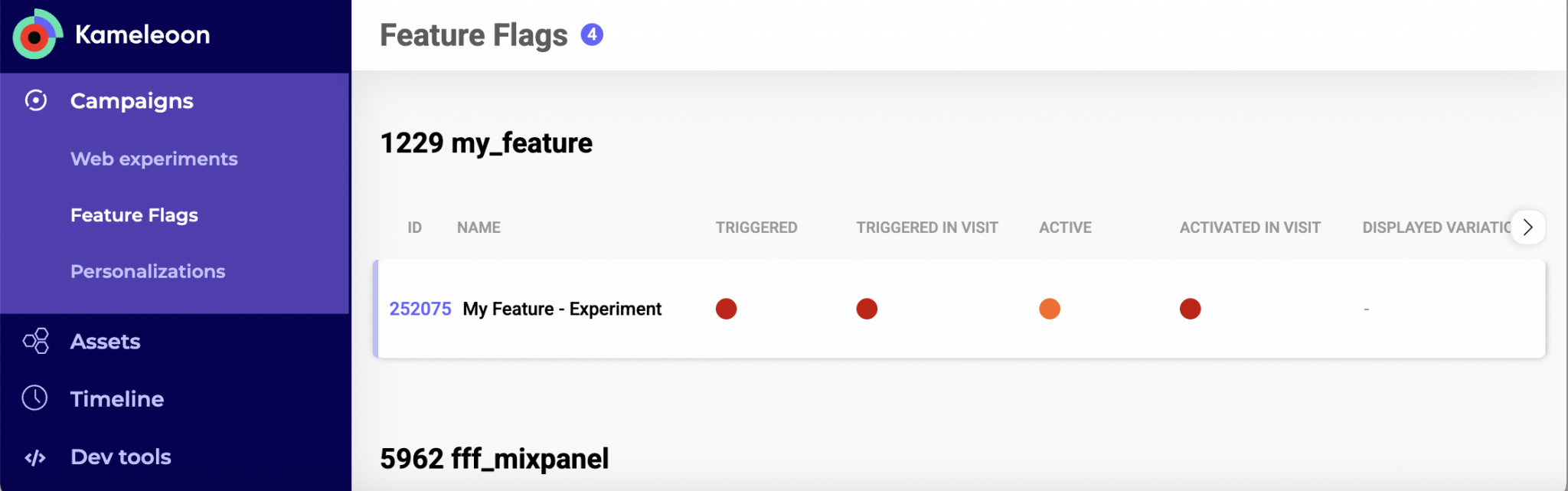 The Feature flags tab contains all feature flags that Kameleoon detects on the page.