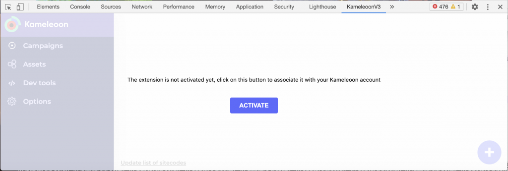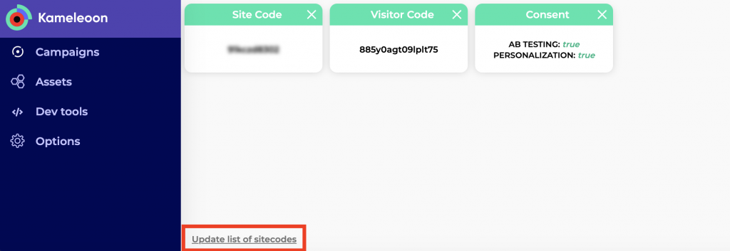 If you add a new website to your Kameleoon account, you can also update your authorizations by clicking Update list of sitecodes at the bottom of the extension dashboard.