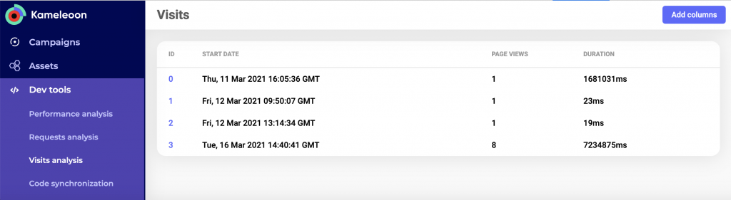 - Displayed variation: ID of the displayed variation. No variation indicates that the user isn't targeted. 0 refers to the reference variation.